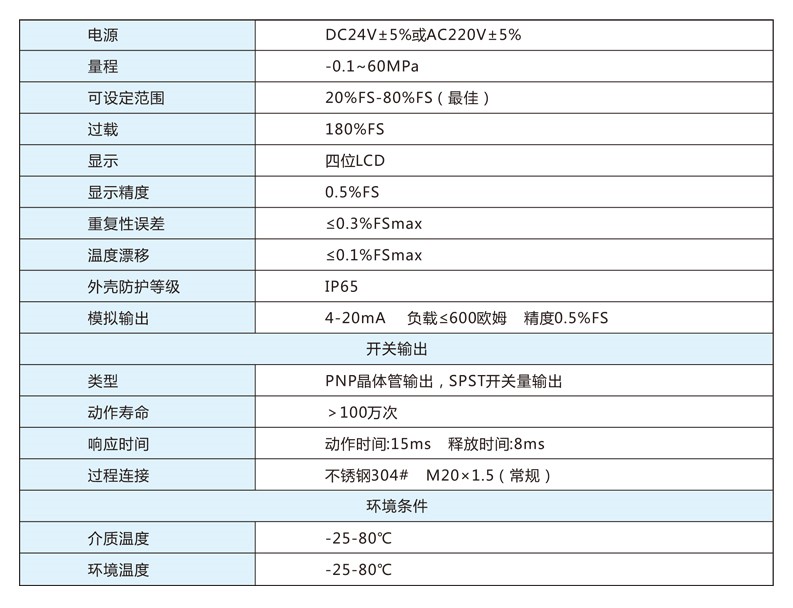精度高,重復(fù)性好,壽命長(zhǎng),無(wú)膜片,無(wú)觸點(diǎn),耐腐蝕性強(qiáng),設(shè)定靈活方便,顯示直觀,溫漂小